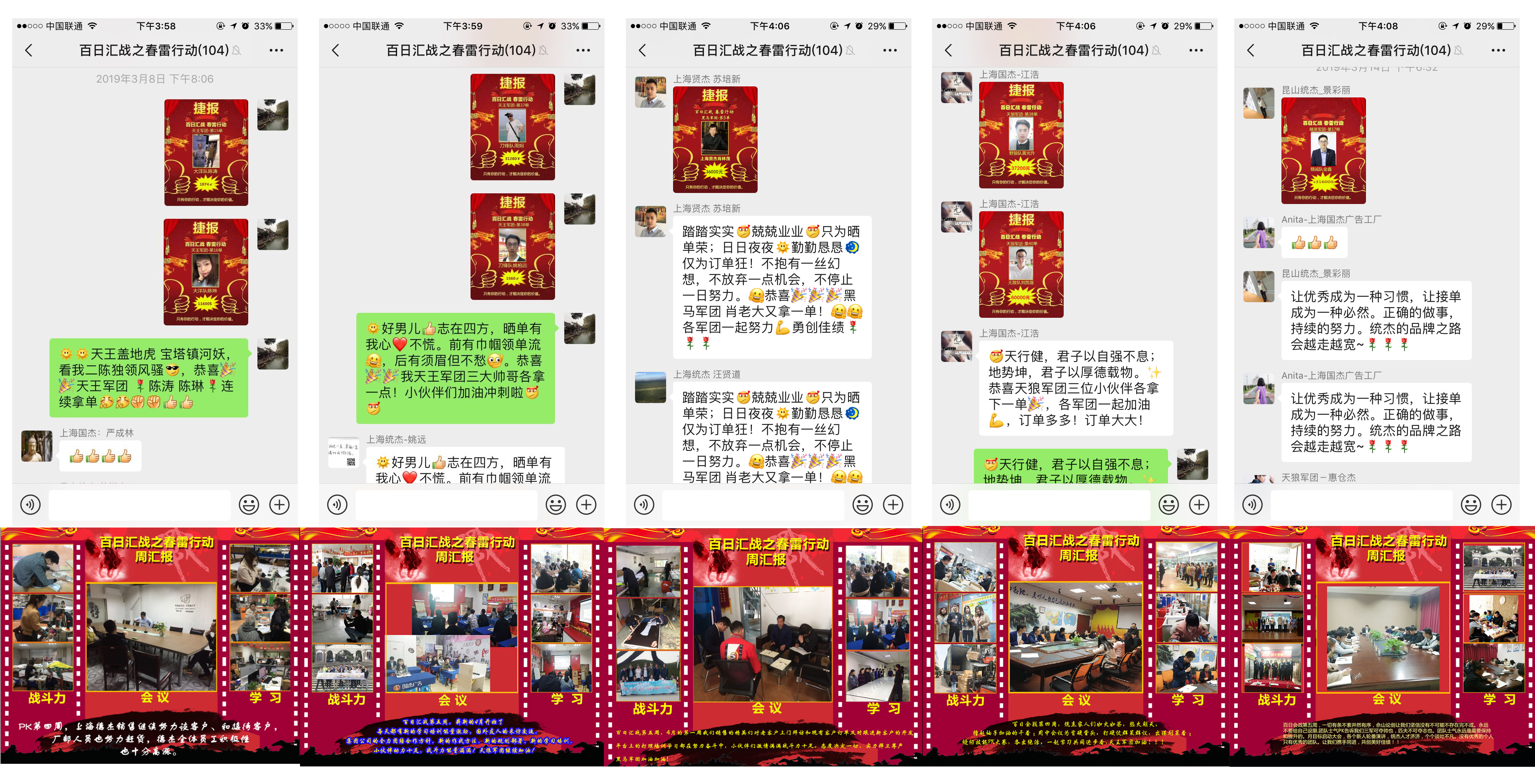 百日会战日每天5点后各军团依次发发战报并配有相应打起文案,PK氛围浓厚一周过去后,各军团会针对上一周的数据做个总结通报,并做周报发送到群里,使得小伙伴们紧迫感十分强烈,更加努力接订单